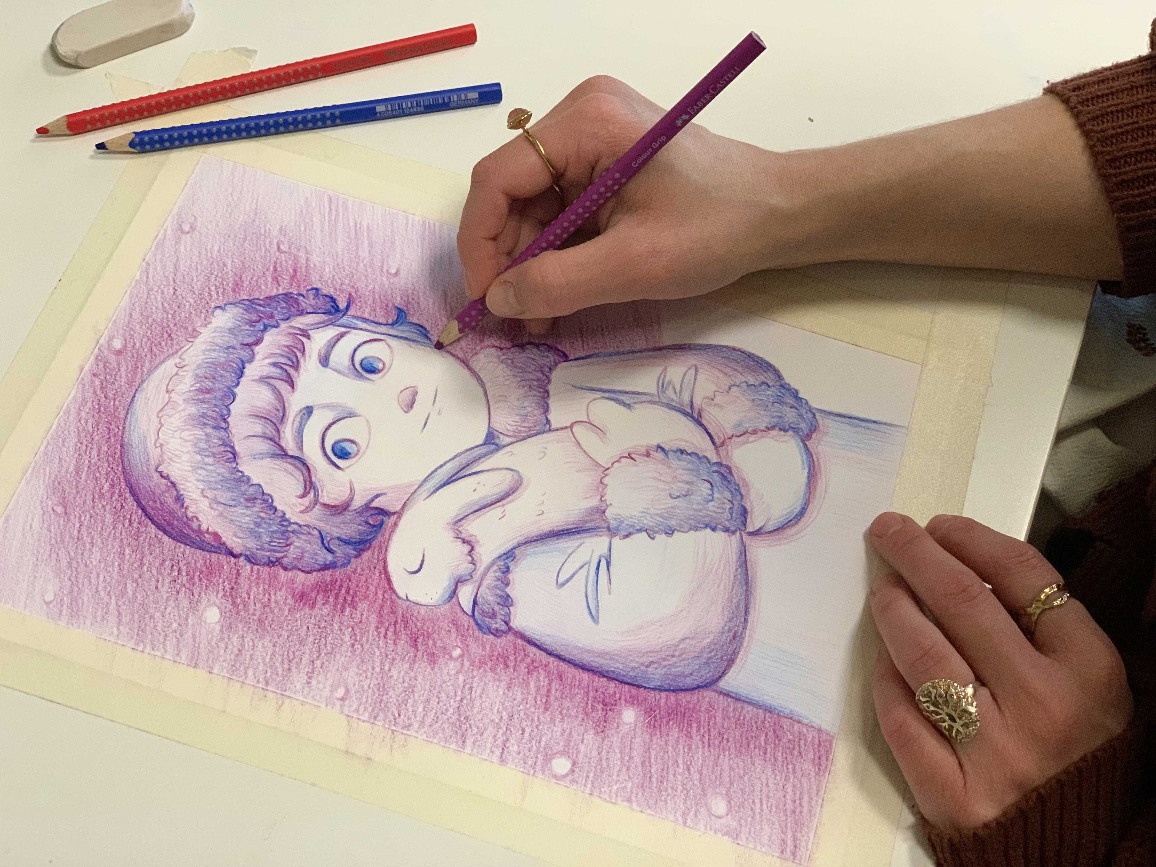 Vi starter med at lave en skitse og en visualisering, inden vi arbejder på selvportrættet med farveblyanter i fine vinterfarver.